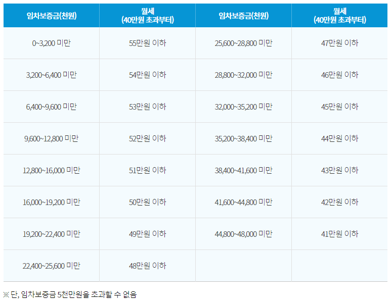 월세 40만원 초과하는 경우 신청 가능한 보증금 및 월세액 범위