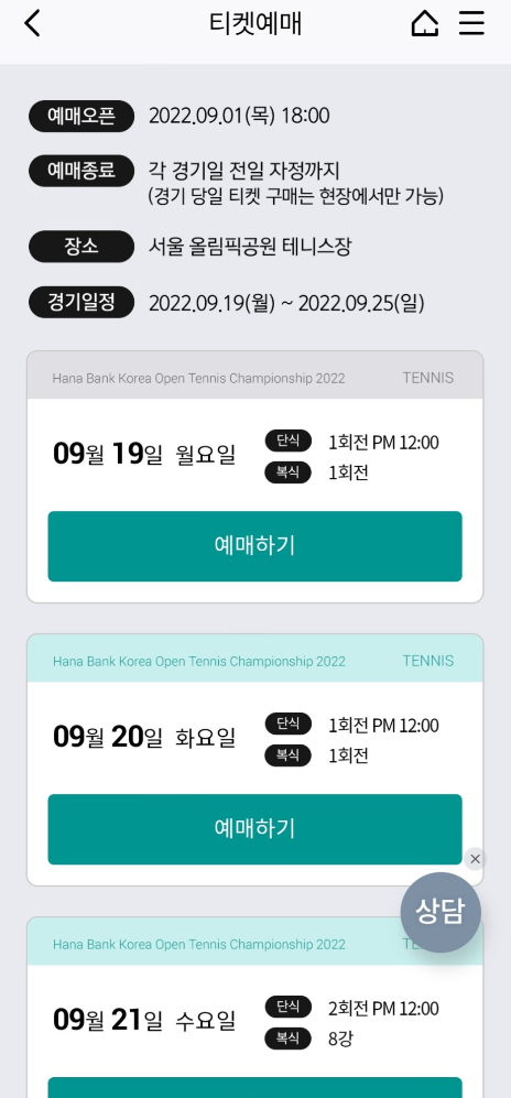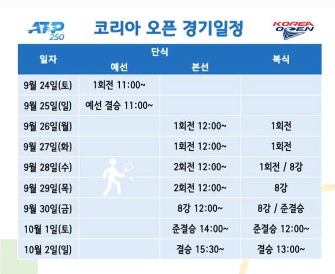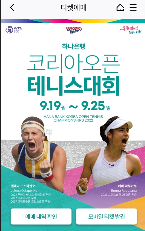 참고로 ATP250 티켓예매는 9월 19일 오후 티켓링크를 통해서 예매가 가능하다고 코리아오픈 측에서 밝혔습니다.