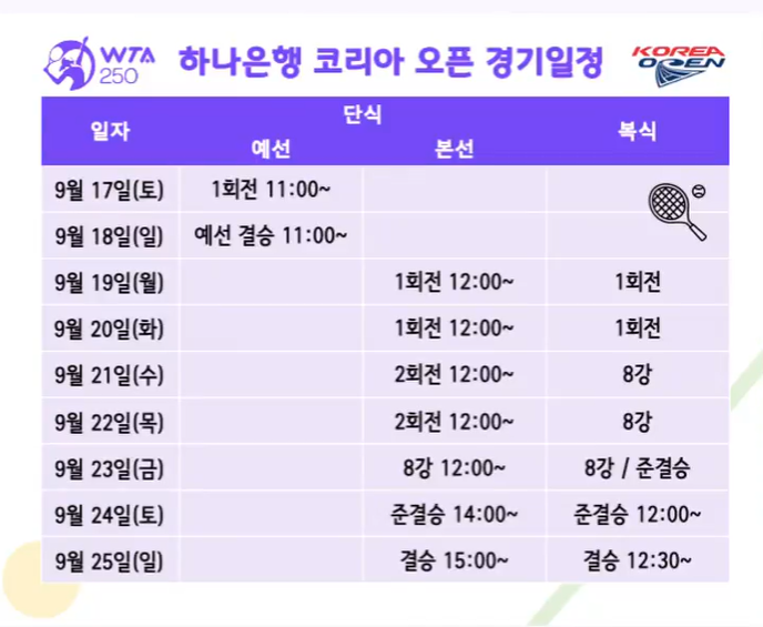 ATP코리아오픈은 9월24일부터 10월2일까지 9일간 올림픽공원 코트에서 개최되며, 바로 전주에는 국내 유일의 WTA투어인 하나은행 코리아오픈 테니스대회가 엠마 라두카누(영국), 엘레나 오스타펜코(라트비아) 등의 스타 플레이어가 참가하는 가운데 9월17일부터 25일까지 9일간 같은 장소에서 열립니다.