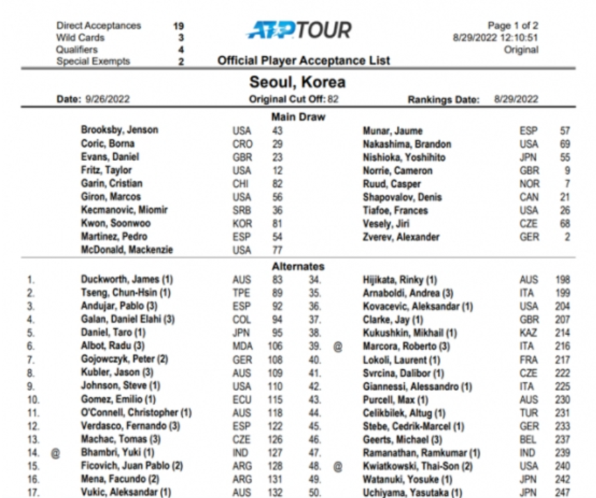 2022 ATP코리아오픈(총상금 128만달러)의 화려한 출전 라인업이 확정되었습니다.6년만에 부활한 ATP코리아오픈에 톱10 3명의 선수가 참가합니다. 세계 랭킹 2위의 알렉산더 즈베레프(독일), 7위 캐스퍼 루드(노르웨이), 9위 캐머런 노리(영국) 등이 한국을 찾습니다.