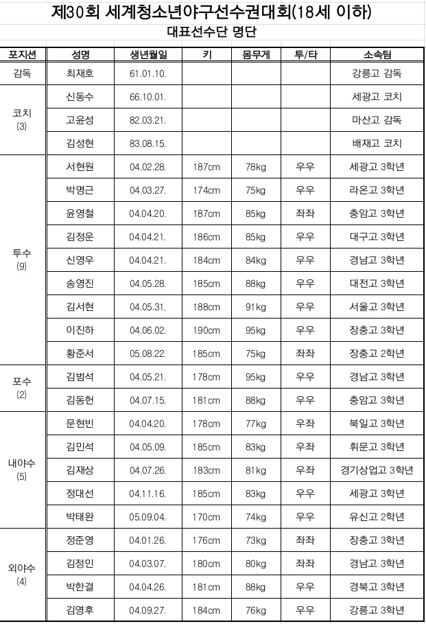 대한야구소프트볼협회(회장 이종훈·KBSA)는 오는 9월 9일부터 18일까지 미국 플로리다에서 개최되는 제30회 세계청소년야구선수권대회(18세 이하)에 참가할 청소년 국가대표팀 코칭스태프와 선수를 최종 선발했다고 21일 발표했습니다.