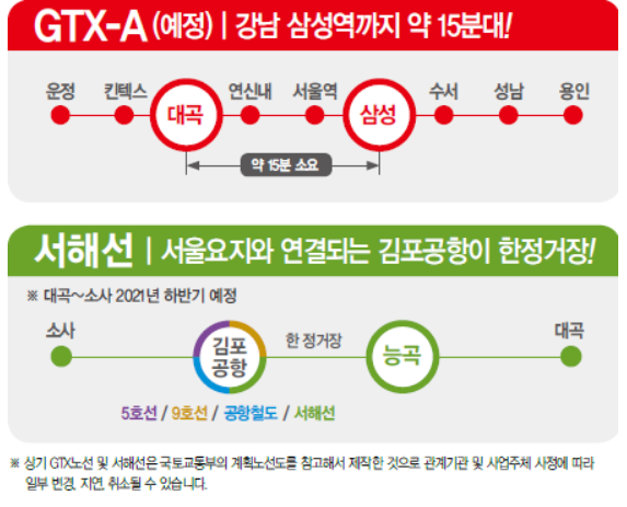 우선, 지하철 역은 지하철 3호선·경의중앙선 환승역인 대곡역과 경의중앙선 능곡역이 있습니다. 또한 현재 추진 중인 GTX-A노선(운정~동탄)이 대곡역을 지나게 되며 서해선(대곡~소사 구간)도 예정돼 있어 향후 4개 노선이 갖춰질 예정입니다.