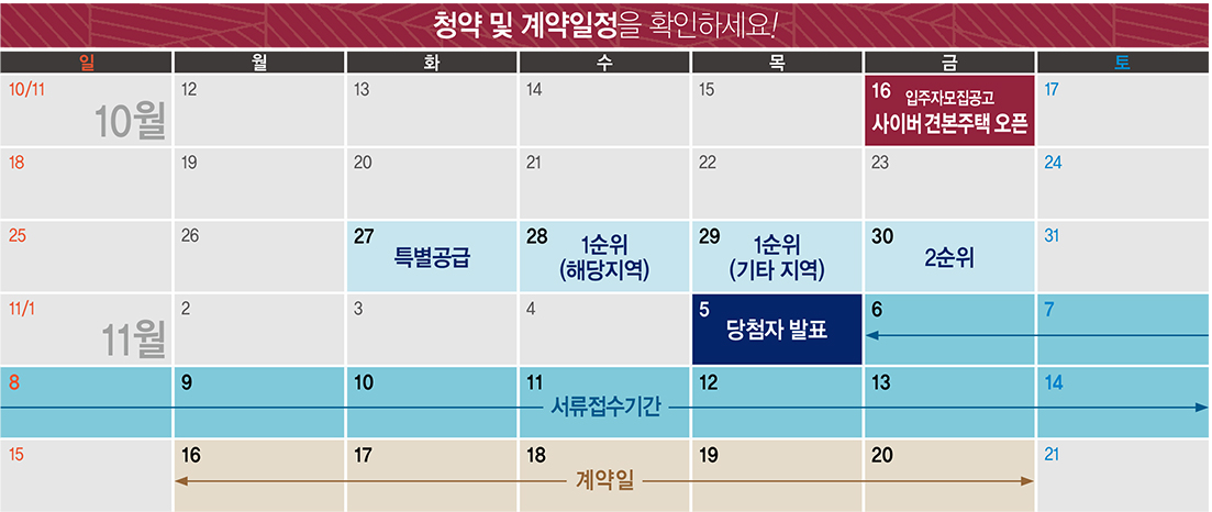 10월 27일 특별공급을 시작으로, 28일 1순위 당해, 29일 1순위 기타, 30일 2순위 청약이 진행됩니다.