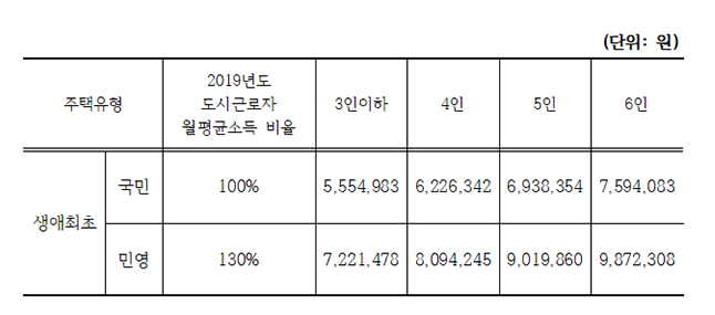 3인 이하 가구 기준 722만 원(←555만 원), 4인 가구 기준 809만 원(←622만 원)