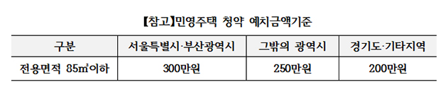 * 투기과열지구 등 : 통장 가입 2년 이상, 지역별 예치금액 충족자(특별시 300만원 등)