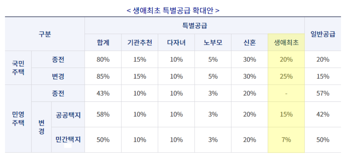 말 그대로 생애최초 태어나 처음 집을 사려는 사람들을 위해 특별공급 전체 주택 공급 물량 중에서 이들을 위한 물량을 따로 빼서 공급하겠다는 뜻으로 이해하시면 됩니다.