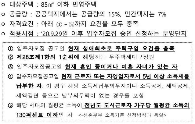 즉, 무주택 실수요자들이 주택을 조금 더 쉽게 분양 받을 수 있도록 일반인과의 청약 경쟁(가점제) 없이 100% 추첨제로 당첨자를 뽑기 때문에 실수요자의 당첨 기회가 매우 높아질 것으로 예상하고 있습니다. 특히 청년과 신혼부부라면 무조건 관심을 가져야 할 정책입니다.